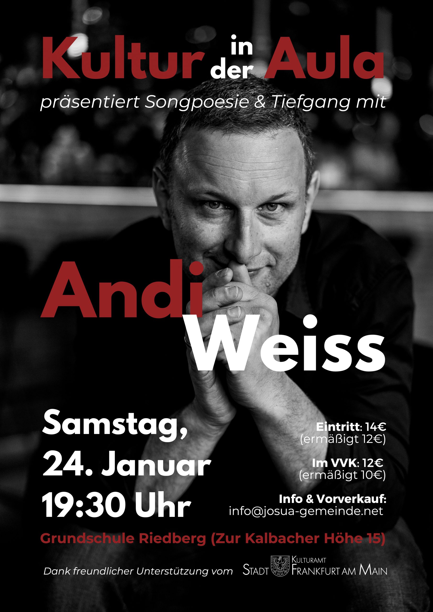 Wer sich mit Andi Weiss unterhält bekommt rasch folgendes zu hören: „in diesen verrückten Zeiten.“ Meist dauert es nicht lange, bis sie fallen, meist mit einem Lächeln. Und genau diese verrückte Zeit haben den Münchner Songpoeten zu seinem Programm inspiriert. Rund 1.000 Auftritte und weit über 100.000 verkaufte Bücher und CDs prägten die letzten 10 Jahre seines Schaffens als Solokünstler. Eigene Lieder, gewürzt mit Texten und Geschichten, regen zum Nachdenken, Schmunzeln, Weinen und Träumen an. Dafür wurde er u.a. mit dem Musikpreis DAVID in der Kategorie „Bester Nationaler Künstler“ ausgezeichnet. Seine Lieder entspringen durchlebten Begegnungen – mit sich und anderen Menschen – und geben den flüchtigen Momenten des Lebens ein Gesicht. Diese nachhaltige Begegnung gelingt Andi Weiss mit anrührenden Geschichten, wunderschönen Piano-Arrangements, kurzweiligen Erzählungen und bebilderten Liedern.