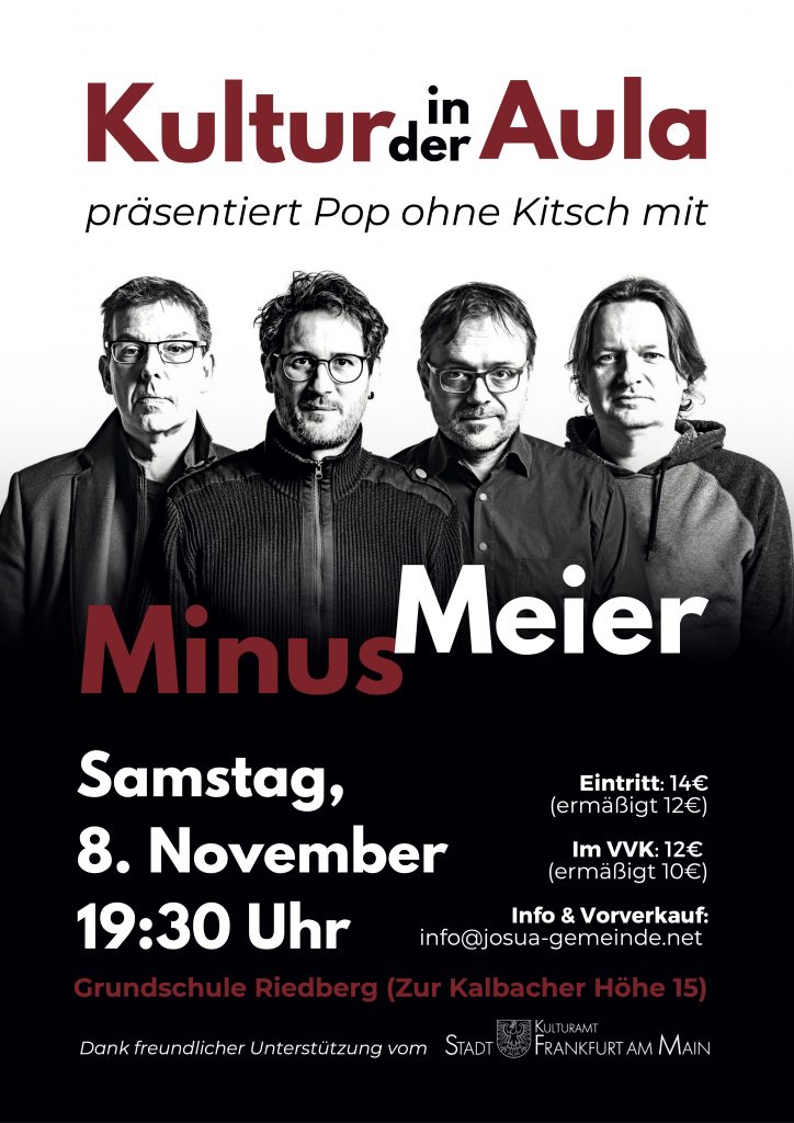 Seitdem spielen die Deutschpop-Poeten MINUS MEIER befreit auf. Als Geheimtipp 2019 für den Hessischen Rock- und Pop-Preis nominiert, überraschen die vier Musiker mit einer enormen Bandbreite zwischen Pop-Rock, Alternative und Liedermachertum und laden zum Zuhören, Nach- und Mitdenken ein.